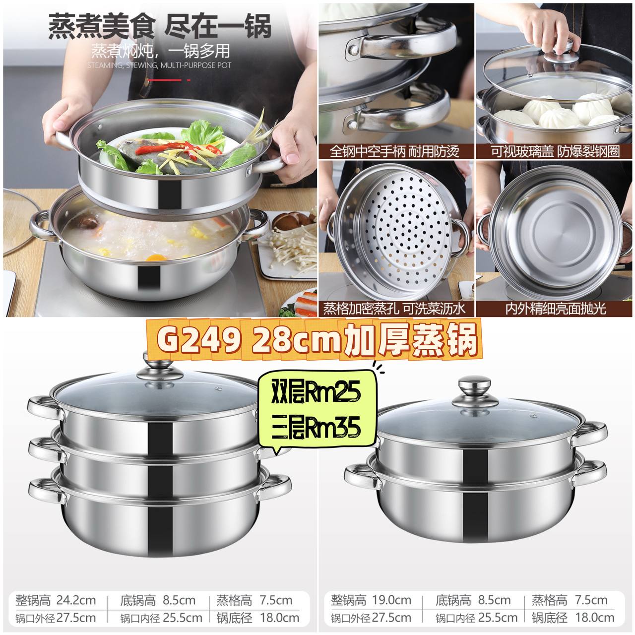 G249 28cm加厚蒸锅 💰双层Rm25 三层Rm35
