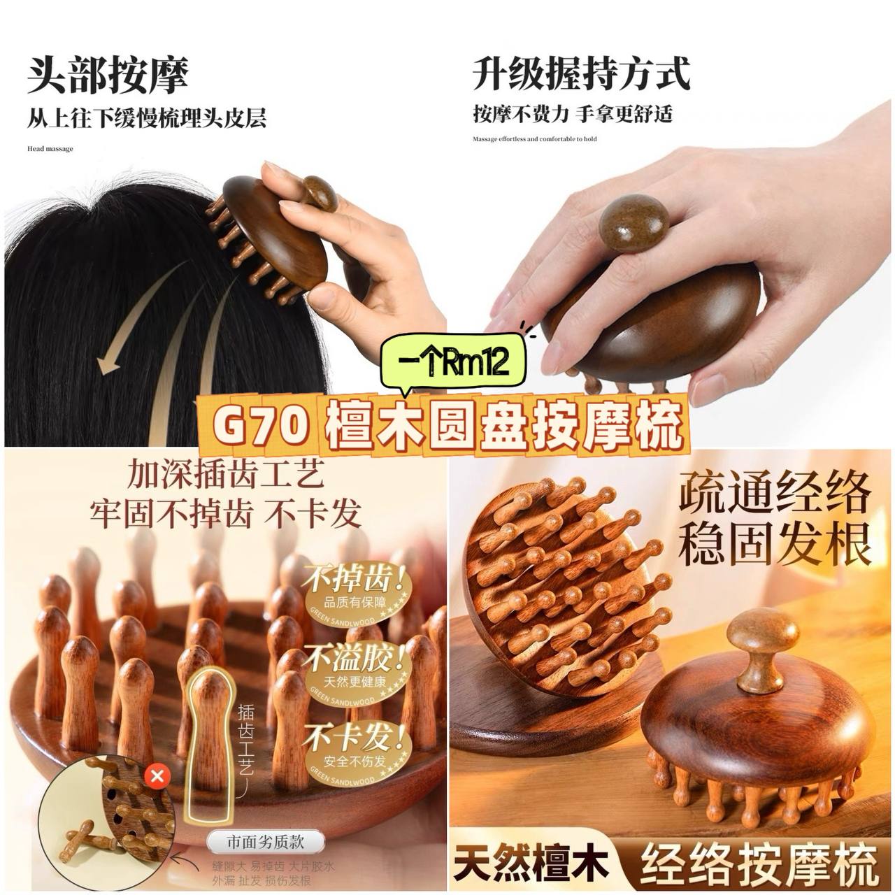 G70 檀木圆盘按摩梳 💰一个Rm12